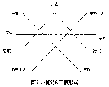 14-16)加以發揚光大,將這三個衝突的形式進一步解析:有敵意的態度包括感受、認知、以及意願三種層面;挑釁行為包括威脅、強制、以及攻擊等三種;而衝突的結構可以分為對稱、以及不對稱兩種模式。我們可以這樣說,態度是主觀的,而行為與結構是客觀的;行為是觀察得到的,而結構與態度是觀察不到的;結構是潛在的,而態度與行為是高昇的(圖2)。其實,維持和平是針對衝突的行為、營造和平是針對態度、而建構和平是針對結構(Galtung, 1996: