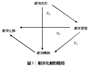 15-16)則提出多重路線的衝突發展階段(圖3),也就是說,由衝突成形到化解,可能有三種進行的方式,並非是一成不變的:(R1)衝突成形 → 衝突管理 → 衝突轉換 → 衝突化解;(R2)衝突成形 → 衝突轉換 → 衝突化解;以及(R3)衝突成形 → 衝突管理 → 衝突化解。他們的意思是說,衝突可以跳過短兵相接的經驗,不用透過維持和平的過程,逕自進入營造和平的階段(R2);另一種可能是在衝突管理以後,沒有經過冗長的衝突轉換,直接進行衝突化解的工作(R3)。