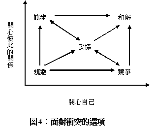 若要突破這樣的困境,我們可以有三種選擇。如果我們只是關心自己的利益、或是價值,在自信心足夠的情況下,可以正面與對手角力、競爭。另一個極端是完全站在對方的立場來看彼此的衝突,以最大的誠意來配合對方,甚至於不惜片面讓步。第三種途徑是嘗試著在兩者之間取得適度的平衡,盼望彼此達成某種妥協,不至於睥睨一切、也不過於委曲求全。長期而言,最好的策略是進行合作,看是否能超越舊有的關係、解決當前的齟齬、轉換現有的衝突,已達到和解的境界。