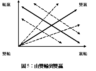 理想上而言,我們期待的衝突途徑是由規避、妥協、到和解;事實上,卻不一定會朝如此對稱的方式來作線性發展。如果我們以「我贏你輸」、以及「我輸你贏」兩個軸線來看(圖5),由「雙輸」到「雙贏」,其實是有兩股力量在運作(Miall, et al., 1999: 5-7, 11)。第一股力量決定「雙輸 → 雙贏」這條線斜率陡峭與否(越陡代表對方贏得越多、我方贏得越少),主要看官方的外交談判如何角力;第二股力量決定「妥協線」是否往雙贏的方向儘量遠離雙輸的原點(越往外移動代表的是全體的滿足感越大),端賴民間社會嫌惡玉石俱焚的程度、以及向領導者施壓的意願。換句話說,只要不是在你死我活的兩條零和軸線上,雙方都可以取得滿足感;問題是,這些滿足感如何分配?