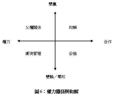 John Burton (1986) 以「權力vs.合作」、以及「雙贏vs.雙輸/零和」兩個軸線來看衝突進行的四種模式(圖6)。首先,如果以權力著手,根據衝突的結果是雙贏、還是雙輸/零和,可以分別稱為父權關係、以及衝突管理。儘管前者的結果是雙贏,不過,畢竟是由強有力的第三者所施加,即使並非城下之盟,爭端的雙方或許會難以覺得舒坦。後者是典型的由第三者進行爭端處理,也是聯合國比較樂於採取的和平途徑,特別是包括人到干預、以及預防性外交在內等各種強制執行和平的方式。