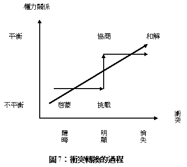 12-14)則進一步使用「權力關係是否平衡」、以及「衝突發展」兩個軸線,以階梯的方式來呈現衝突轉換的過程(圖7)。在衝突開始的階段,一方面是爭端雙方的權力關係極度不平衡,另一方面,也因為被支配者刻意隱瞞、絕口不提自己的困境,因此,表面上看起來似乎是一團和氣。這時候,必須有人願意挺身出來進行教育的工作,啟蒙己方了解本身的遭遇、以及所處的脈絡,進而鼓動要求改變此種關係。也就是說,除非一般百姓能夠覺醒,才能夠加以動員而產生賦予力量(empowerment)的效果(Miall, et